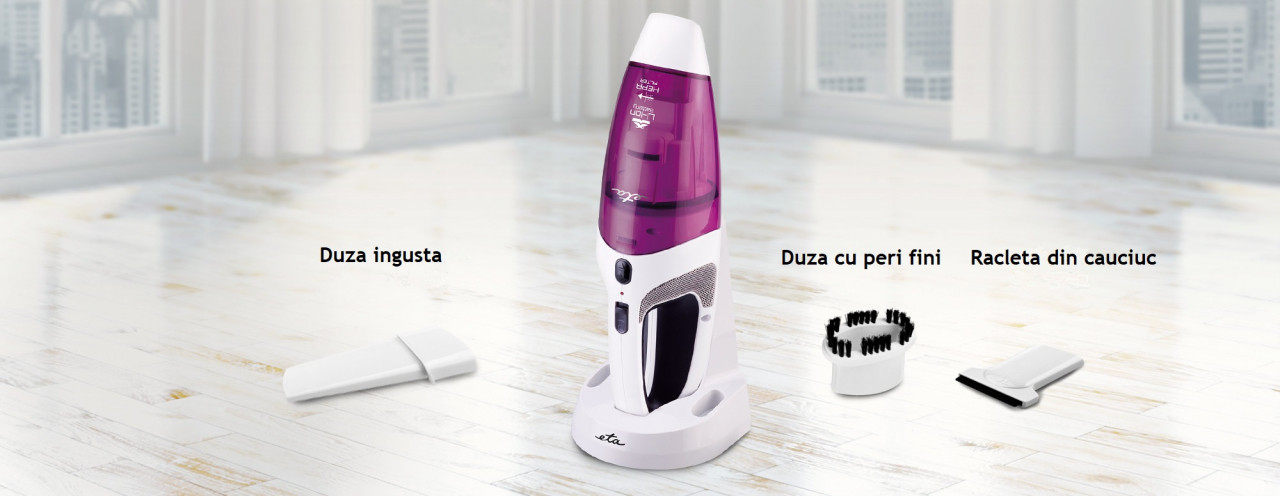 Impreuna cu aspiratorul de mana ETA Verto, veti primi, de asemenea, o duza cu fanta ingusta pentru aspirarea in locuri greu accesibile , o duza cu peri fini pentru suprafete textile si mobilier tapitat. Spatula de cauciuc inclusa va facilita curatarea lichidelor varsate.