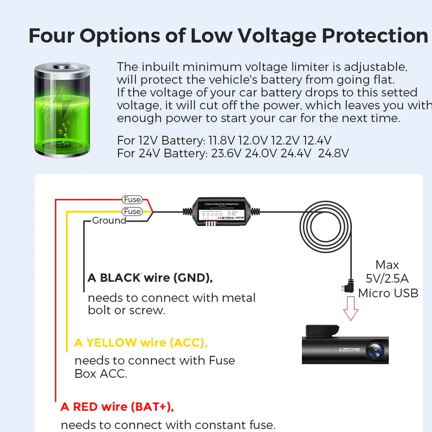 Standarde ridicate de securitate: Kitul Hardwire are functie de detectare ACC, Kitul Hardwire AZDOME Micro USB Dash Cam cu modul de alimentare cu comutare precisa incorporat poate transforma 12V(24V) în 5V. Sistemele de protectie incorporate va protejeaza dispozitivele impotriva curentului excesiv si supraincalzirii.