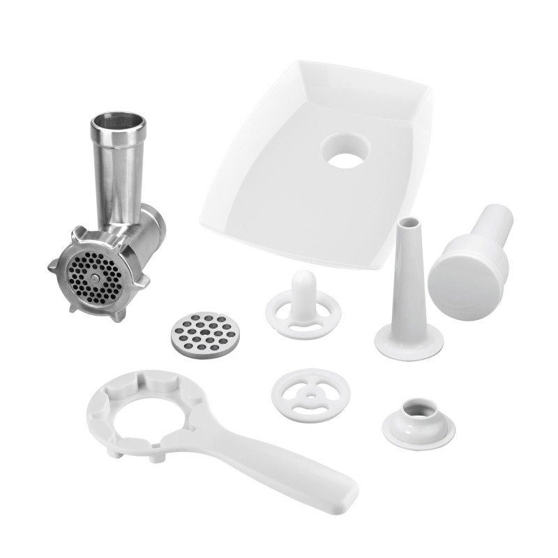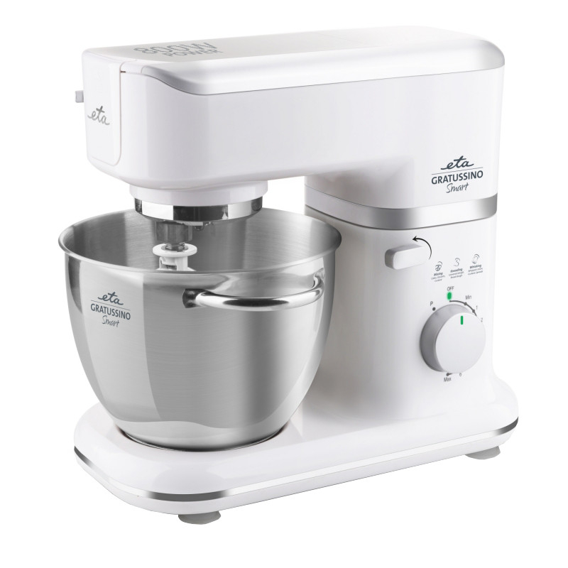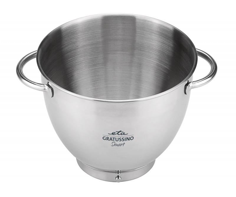 ETA GRATUSSINO SMART se livreaza cu un vas din otel inoxidabil cu volum de 4,5 l si capac transparent. Datorita orificiului mare a capacului, puteti umple cu usurinta bolul cu ingrediente, chiar si in timpul functionarii. Alte accesorii includ un carlig de framantare, un tel pentru batere, un tel de amestecare si o masina de tocat carne cu doua site cu orificii medii si mari. In pachet veti gasi, de asemenea, alte accesorii utile, cum ar fi atasamente pentru umplerea carnatilor si a tuburilor de carne Kebbe, un tamper (impingator) foarte practic si o cheie de strangere.