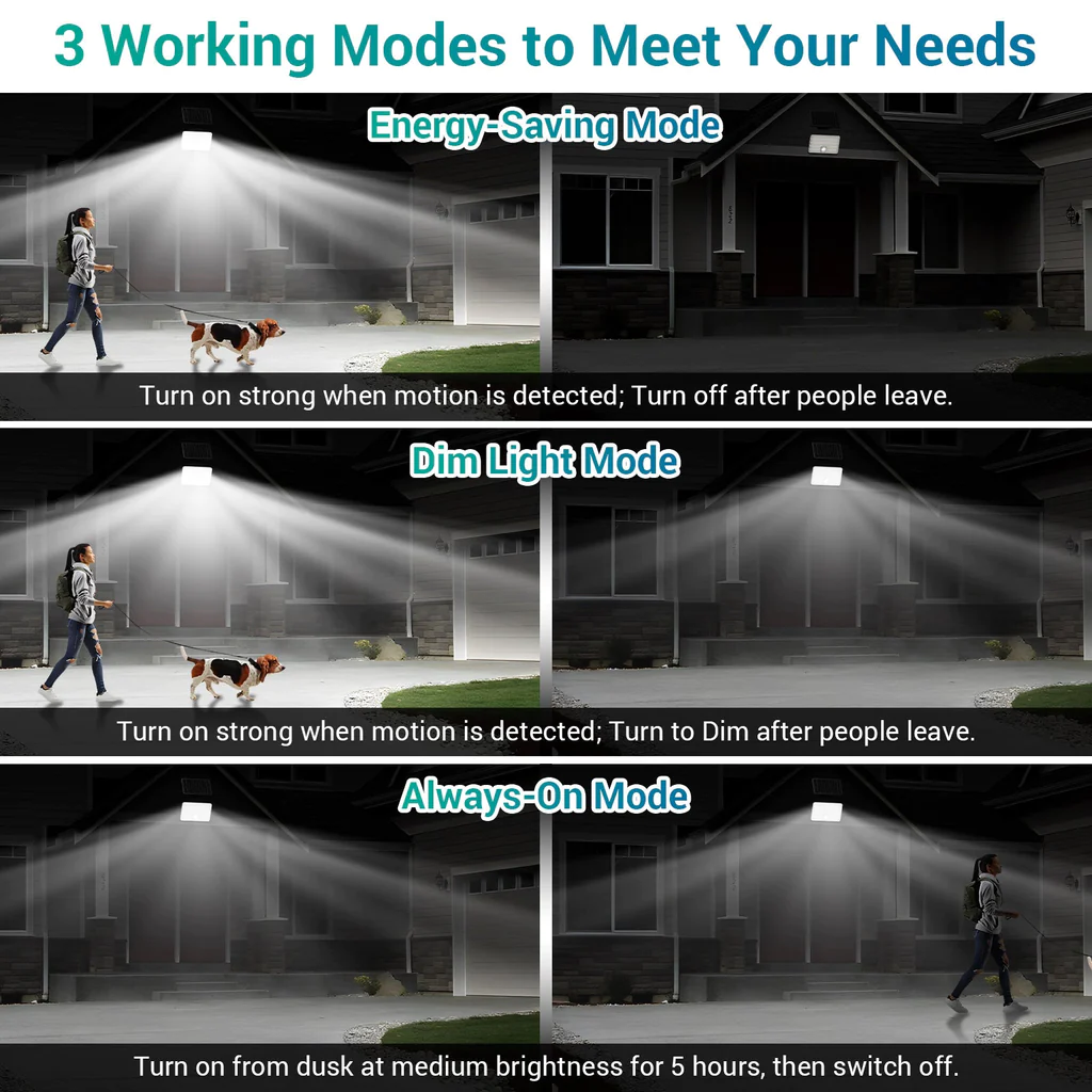 【Telecomandă și 3 moduri de iluminare】 Lampa solara cu senzor de mișcare este echipată cu telecomandă. Are 3 moduri de functionare: ① Modul senzor de miscare lumina puternica ② Modul senzor de miscare lumina slaba ③ Modul de lumină mereu pornita.