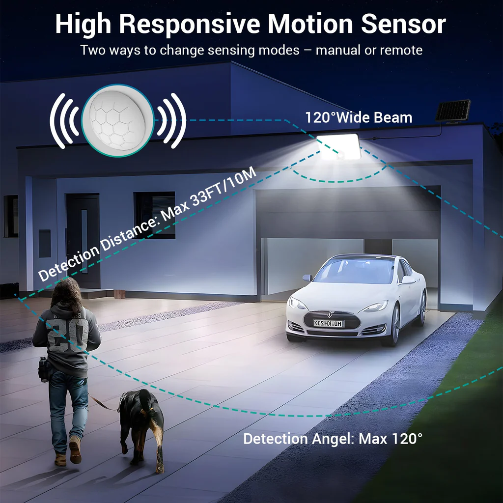 【Senzor sensibil și luminozitate ridicată】 Echipat cu un senzor sensibil de mișcare PIR și 85 de leduri LED super strălucitoare. Lampa solara produce o luminozitate de până la 2500LM 6500K și o bună disipare a căldurii. Iluminați-vă perfect curtea, garajul, verandă sau terasa.