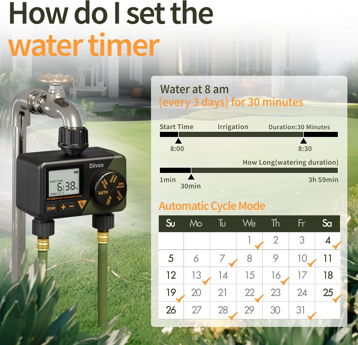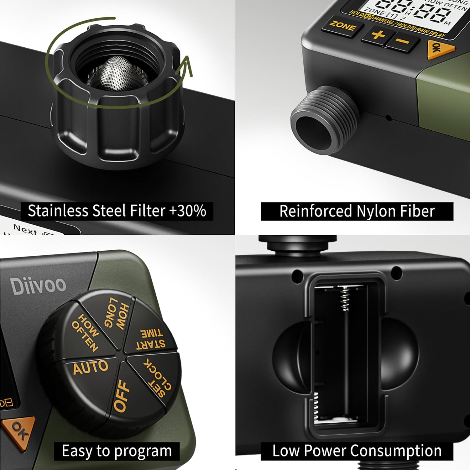 【Usor de Instalare si Utilizare】Timerul programabil pentru furtun vine cu doua conectori rapizi de 1/2". Pur si simplu ataseaza filetul timerului cu 2 statii la orice furtun de gradina standard de 3/4" sau 1/2". Timerul Diivoo pentru furtun are protectie IP54 care satisface necesitatile zilnice. Necesita 2 baterii AA 1.5V (nu sunt incluse), iar durata de viata cu un set de baterii este de 6~8 luni.