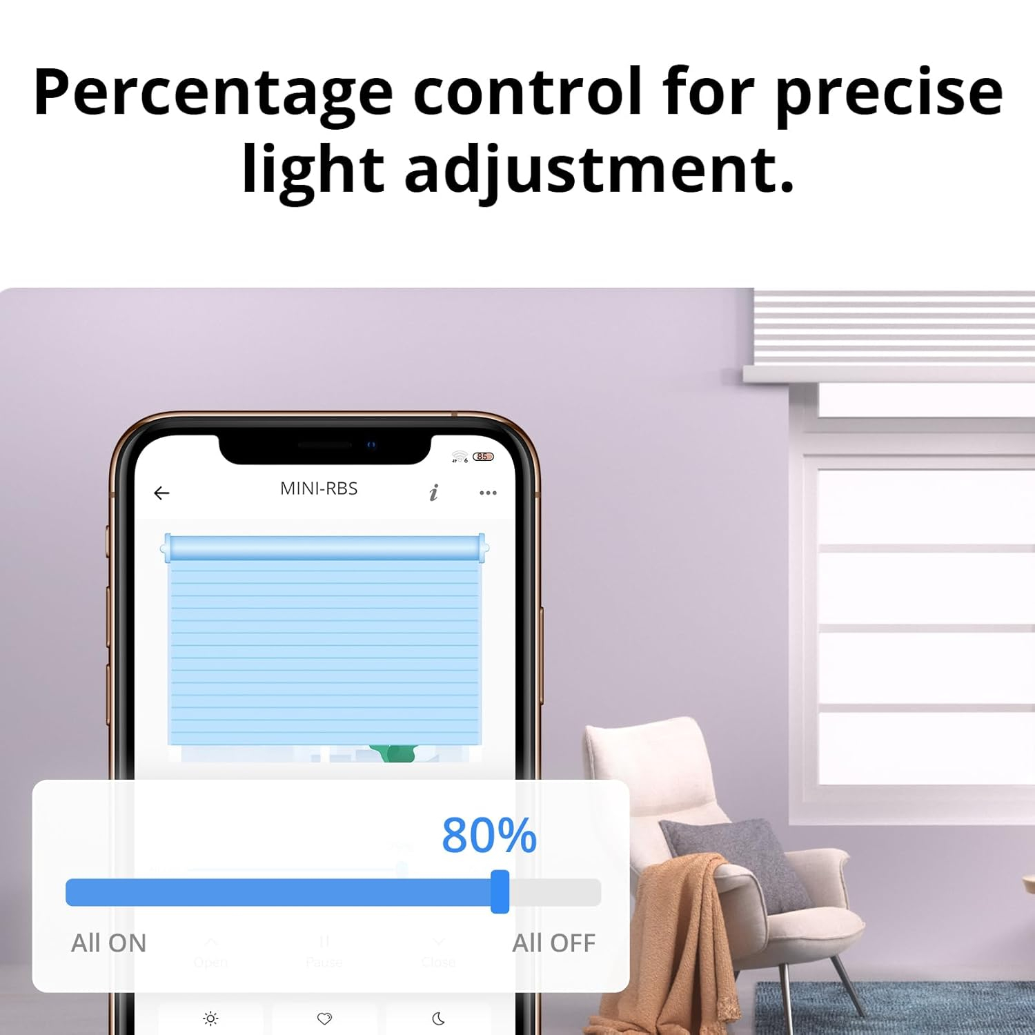 Dispozitivul va permite sa setati procentul exact de deschidere a jaluzelelor - ajustand perfect cantitatea de lumina care intra in casa in functie de nevoile ocupantilor. Fie ca doriti sa reduceti stralucirea ecranului, sa creati o atmosfera intima seara sau sa aveti grija de iluminarea plantelor, MINI-RBS ofera un control complet cu un singur clic.