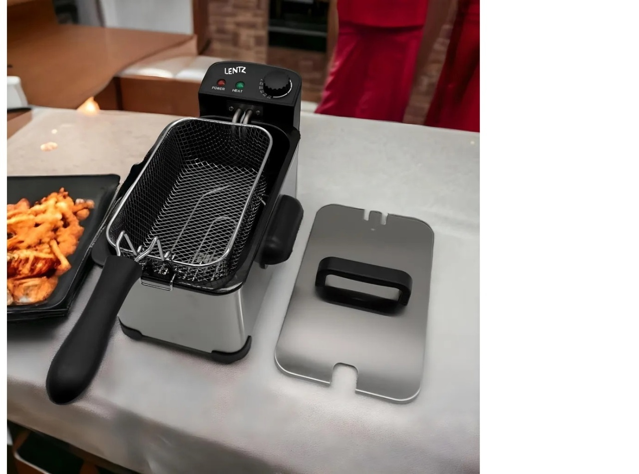 Friteuza cu ulei LENTZ 10200 cu o putere de 2000W are carcasa din otel inoxidabil. Deasemena capacul este din otel inoxidabil. Acesta acopera uleiul si alimentele prajite si va protejeaza impotriva stropilor. Rezistenta de incalzire se scufunda direct in ulei si va asigura ca mancarea dumneavoastra este prajita rapid.