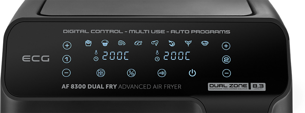 ECG AF 8300 Dual Fry are doua zone de gatit care permit prepararea a doua feluri de mancare diferite, fiecare cu temperatura sa de preparare. Asta iti permite sa gatesti legume si carne in acelasi timp, in zone diferite si sa economisesti timp si bani. Pregatirea mesei se scurteaza astfel la jumatate.