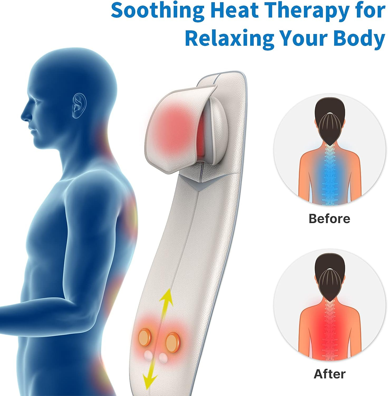 Scaunul RENPHO se distinge prin tetiera inteligenta ajustabila pe verticala. Indiferent de inaltimea utilizatorului, cele 4 noduri dedicate pentru gat pot fi pozitionate exact acolo unde este nevoie.