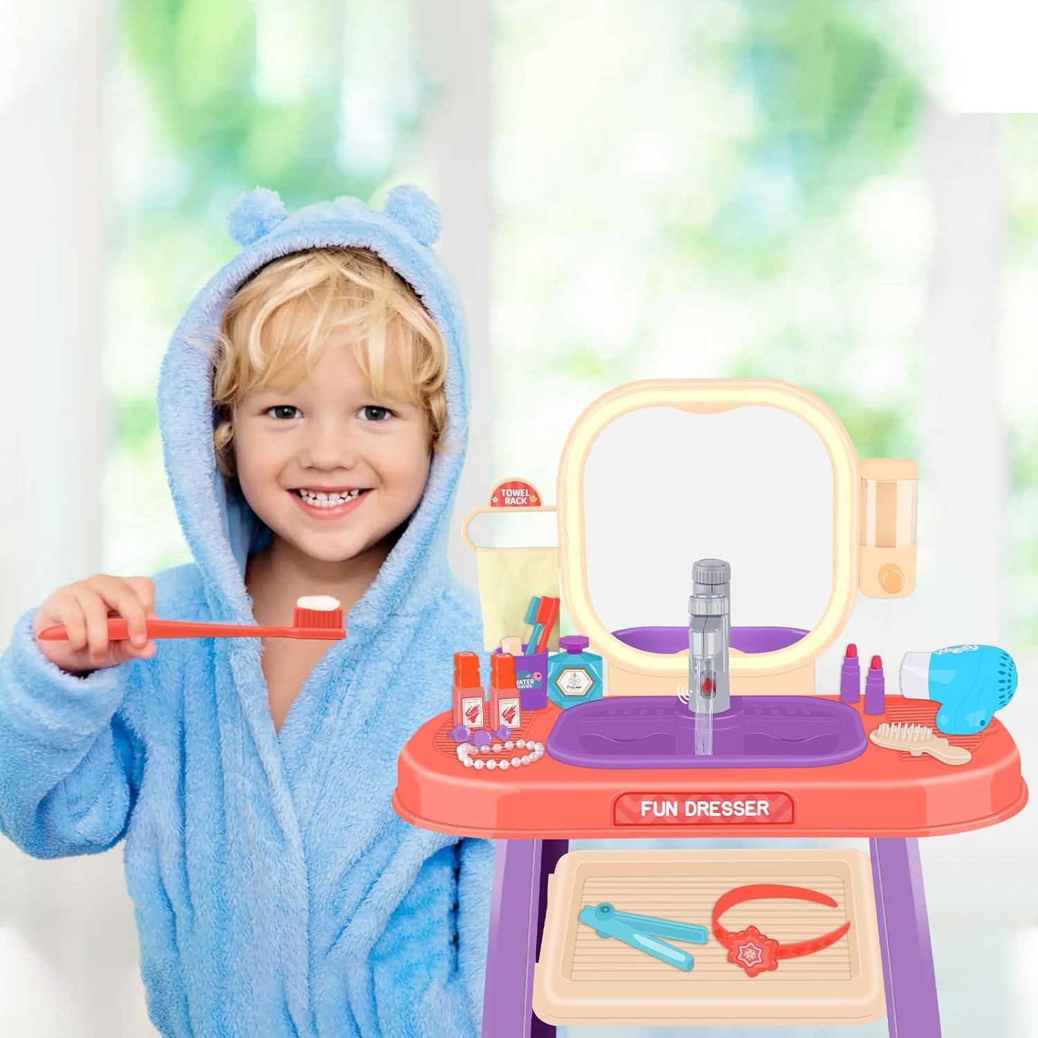 Masuta de Machiaj jucarie Rovo 959 - Acest set de toaleta pentru copii include o masuta de toaleta pentru fetite cu oglinda, lumini si muzica, un dozator functional pentru sapunuri, robinet cu senzor, un uscator de păr functional si multe accesorii.