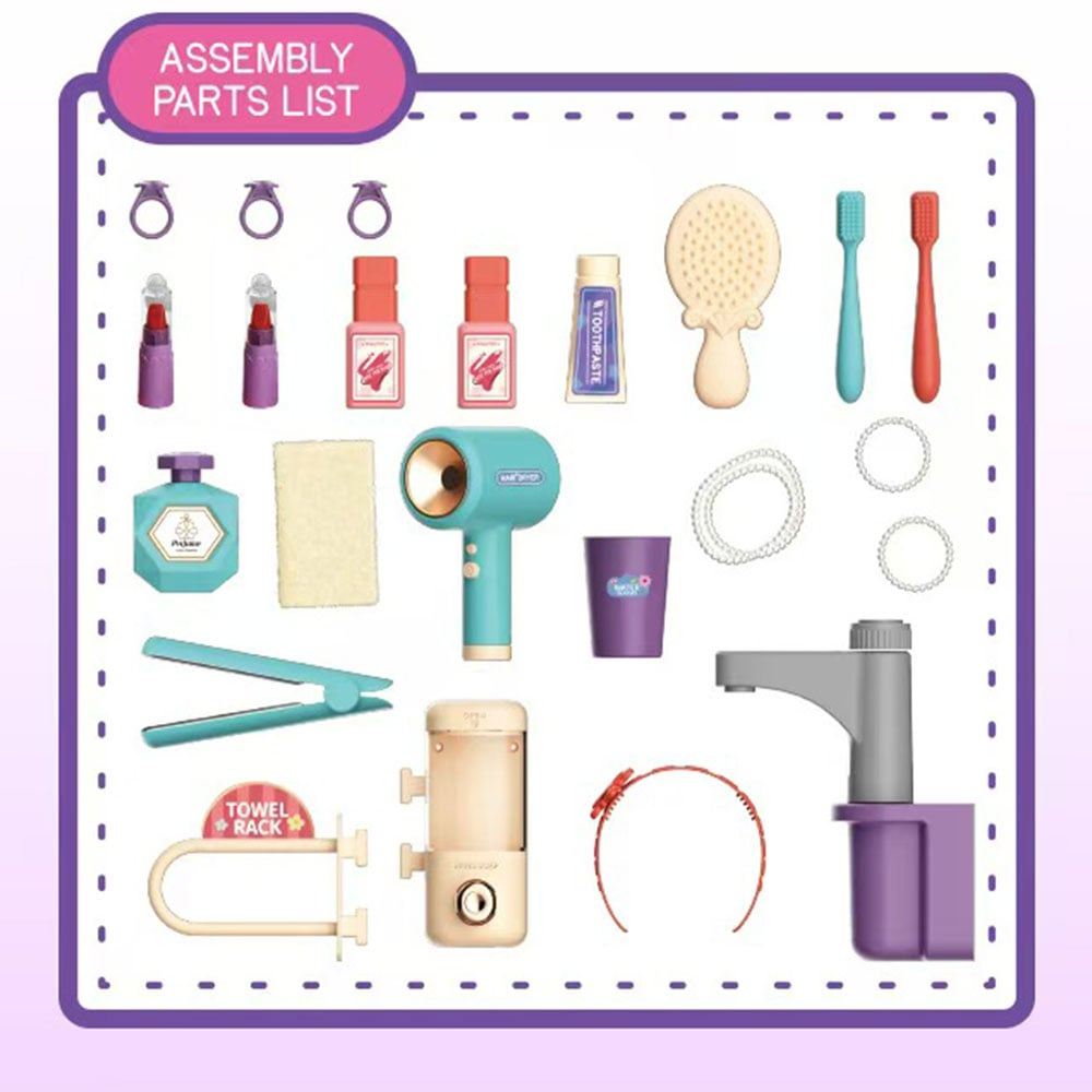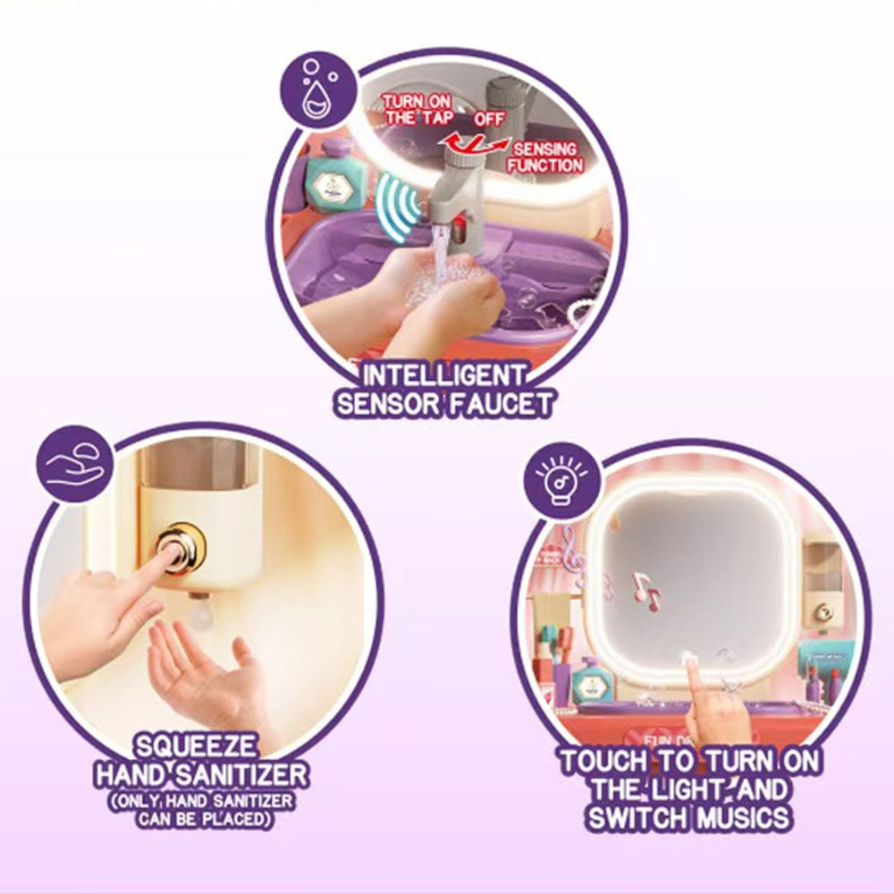 Masuta de Machiaj jucarie Rovo 959, Oglinda cu Lumini LED si Muzica, Robinet cu senzor, Dispenser Sapun, 23 piese