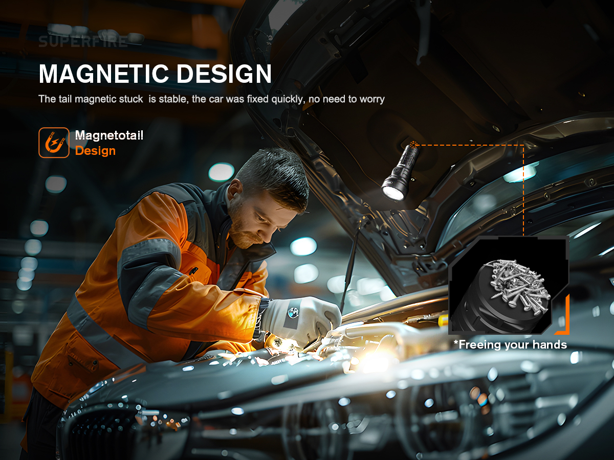 Design ușor de utilizatEchipată cu o interfață intuitivă cu un singur buton, această lanternă este incredibil de ușor de utilizat, chiar și pe întuneric. Mânerul său neted și ergonomic oferă o prindere confortabilă, făcându-l o plăcere de utilizat pentru perioade îndelungate.Dispune de un magnet puternic pentru a vă va oferi și mai multă libertate de acțiune