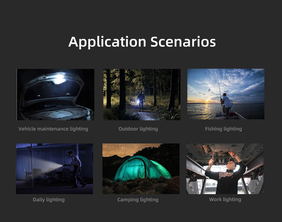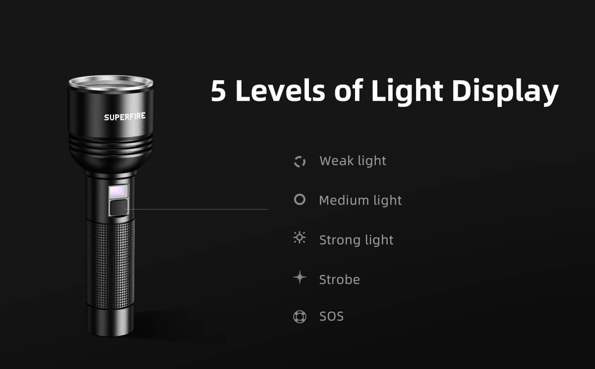 Lanterna are 5 moduri pe care le poți folosi în funcție de nevoile tale. Alegeți între lumină scăzută, medie, puternica, SOS, sau stroboscop.