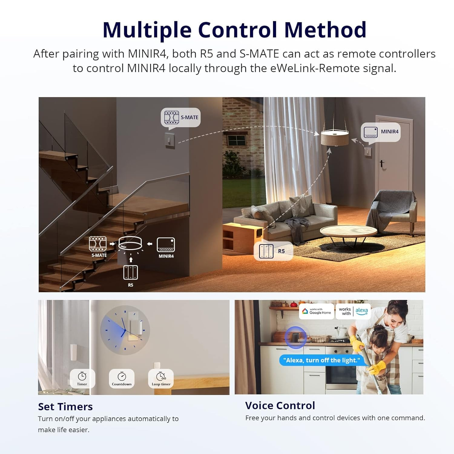 MINIR4 este un comutator inteligent cu funcție de gateway „eWeLink Remote”. Subunitatea „eWeLink Remote” poate fi adăugată, R5 și S-MATE, după asocierea cu MINIR4, atât R5, cât și S-MATE pot fi folosite ca telecomandă pentru a controla local MINIR4 prin semnalul de la distanță eWeLink.