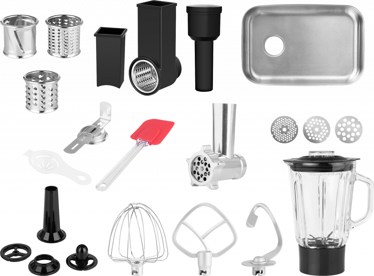 Robotul de bucatarie ECG FORZA 5500 Giorno va va ajuta la multe activitati in procesul de preparare culinara. Gama sa de accesorii este cu adevarat impresionanta. Poti folosi carligul de framantare aluat, paleta si telul din otel inoxidabil. Aveti la dispozitie o masina de tocat carne cu 3 discuri inlocuibile pentru a toca diferite tipuri de carne, razatoare cu tambur si un taietor special pentru prajituri. Desigur, nu putem omite un blender clasic cu lame din otel inoxidabil de inalta calitate si bol de sticla cu volumul 1,5 l.