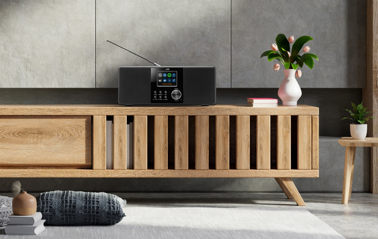 Daca nu sunteti multumit de posturile de radio locale, s-ar putea sa apreciati posibilitatea de a asculta posturi de radio online din toata lumea. Chiar si in acest caz, in memoria unitatii pot fi stocate pana la 40 de posturi. Pentru a utiliza aceasta functie, unitatea trebuie sa fie conectata la Internet prin Wi-Fi. Cu toate acestea, avantajele conectarii radioului la Internet nu constau doar in posibilitatea de a receptiona posturi de radio online. Puteti utiliza, de asemenea, functia Spotify® Connect (Conectare la Spotify) pentru a va conecta cu usurinta playerul la contul dumneavoastra Spotify®. De asemenea, JVC RA-E981B poate fi cu usurinta asociat cu un telefon mobil printr-o conexiune Bluetooth® si utilizat ca difuzor extern.