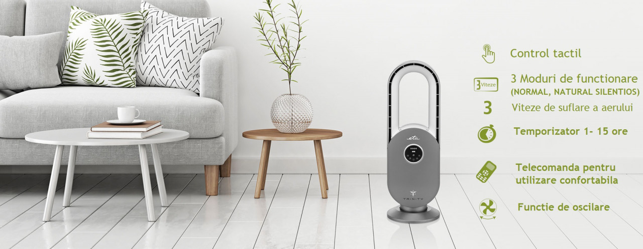 Doriti sa va rasfatati cu o ventilare placuta a aerului, dar nu va mai incanta aspectul ventilatoarelor clasice cu elice? ETA Trinity 3607 modern, aduce nu doar o briza proaspata in casa dumneavoastra, ci si un design elegant care va satisface pretentia estetica. In plus, functionarea este foarte silentioasa, astfel incat nu trebuie sa va faceti griji ca sunteti deranjat in timpul odihnei sau cand sunteti impreuna cu familia la masa.